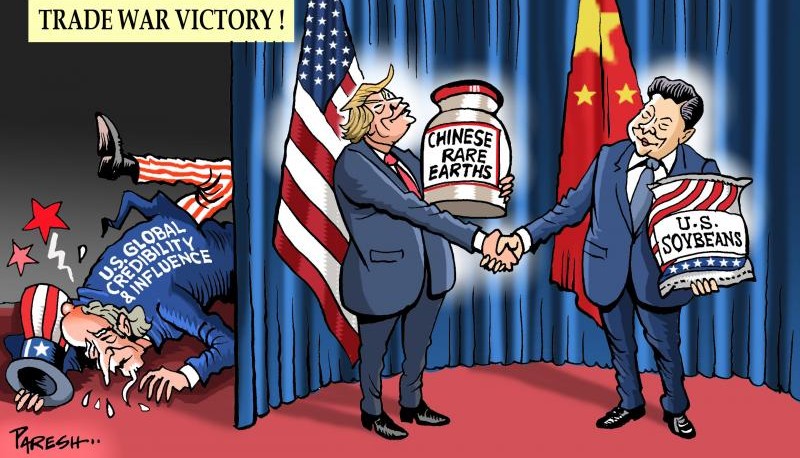 قضت المواجهة بأن تحصل أمريكا على كميات محدودة من كنوز المعادن اللازمة لصناعات عديدة حيوية كالغواصات وبطاريات السيارات وعديد أنشطة الطاقة اللازمة لعمل معامل واستخدامات التطورات الأحدث في تقنيات الذكاء الاصطناعي وغيره. في المقابل خرجت الصين التي لم تقدم أكثر من وعد بصادرات محدودة الكميات والأنواع من المواد الخام الاستراتيجية والنادرة في أوقات تحددها بكين، وهي واثقة من أن أمريكا لن تجد بديلا لها في هذا المضمار، ومطمئنة إلى أنها، أي الصين، لن تجد صعوبة في شراء فول الصويا من دول أخرى في حال حاولت واشنطون في أي وقت حرمانها من منتجاتها الزراعية وبخاصة فول الصويا.